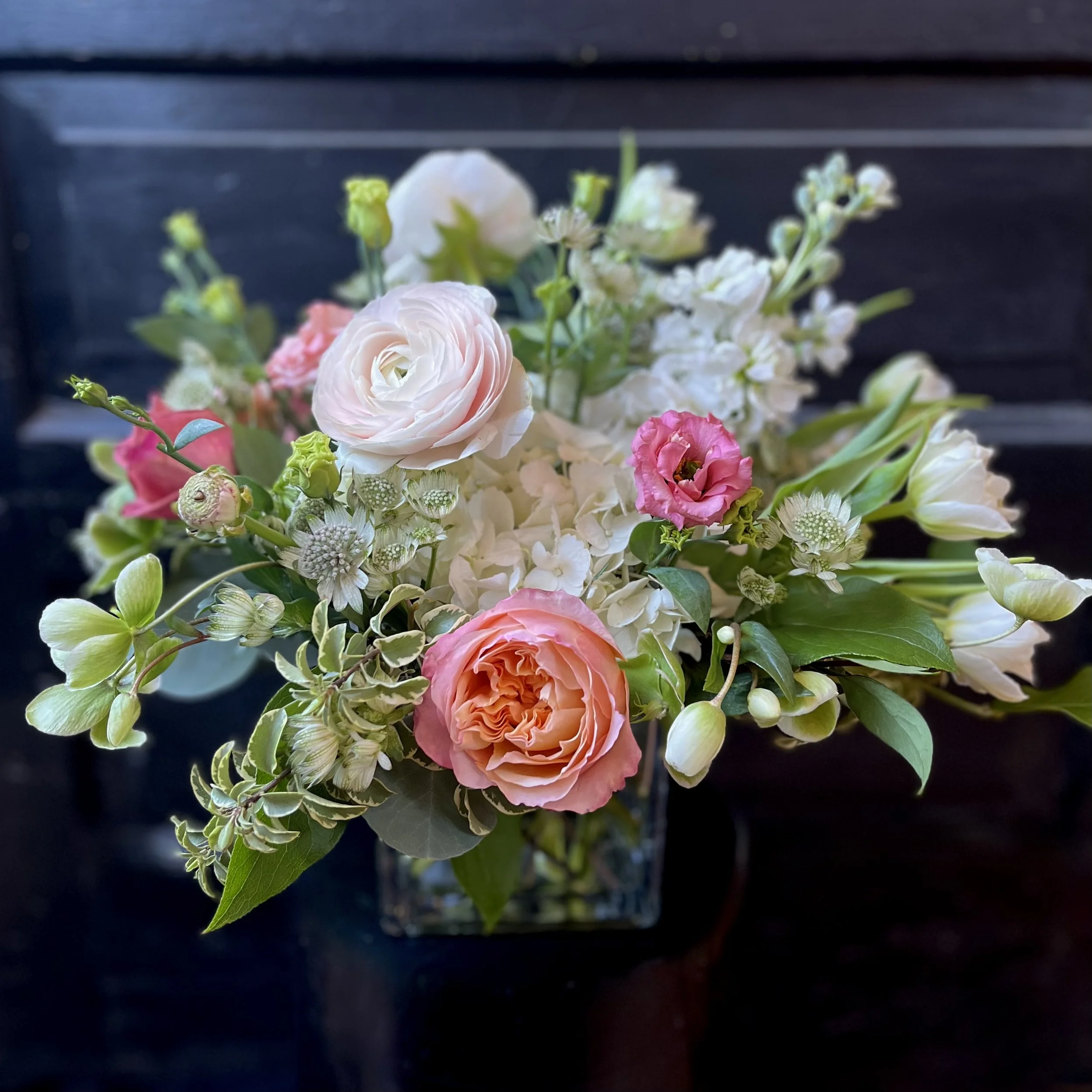 In this Moyenne vased arrangement starring hydrangea, hellebores, ranunculus, & roses, our designers mixed peaches, pinks, whites, & greens for a playful take on Valentines’ hues. $125.00