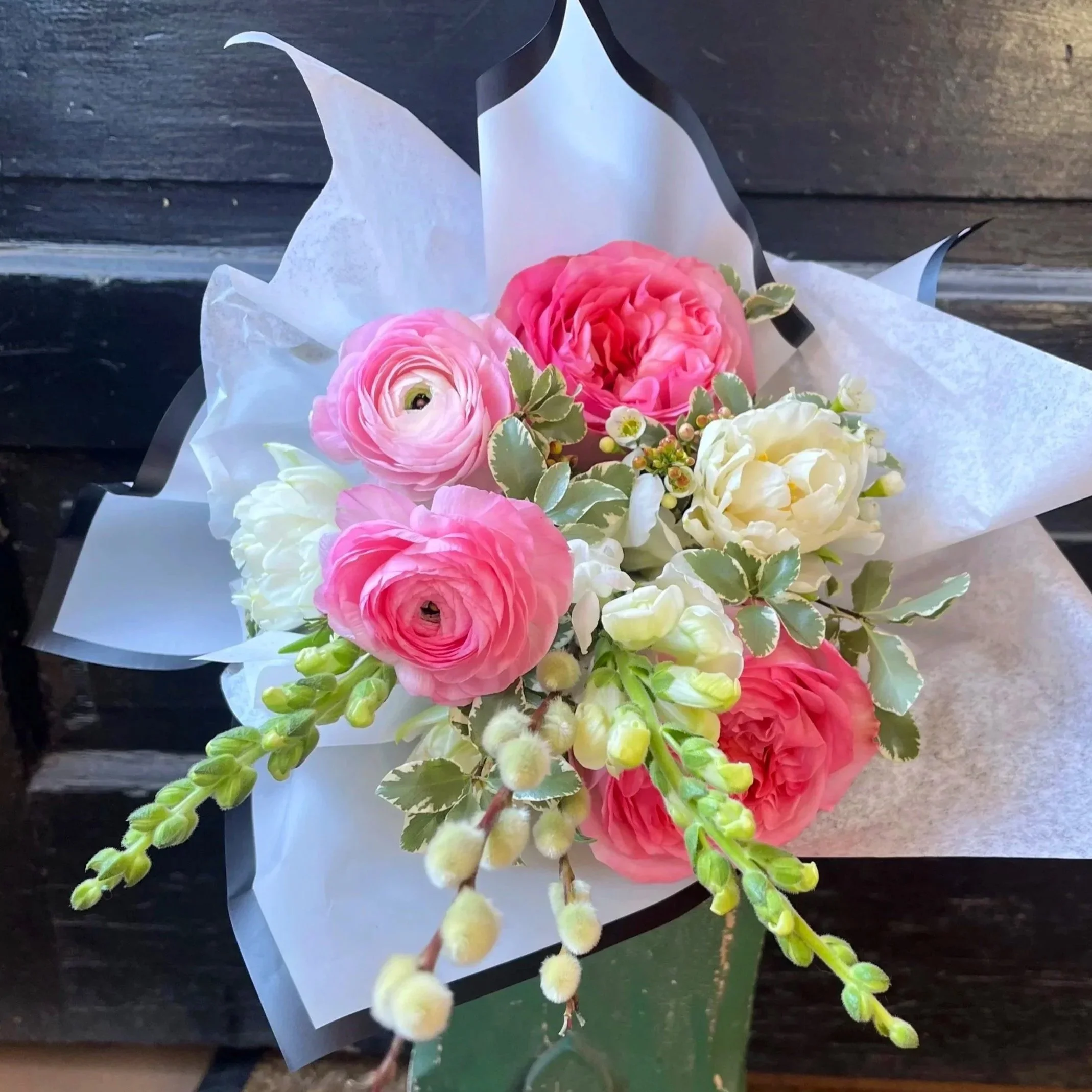Nothing says Quintessential Cupid quite like the pink garden roses, ranunculus, & white double tulips of this charming Moyenne bouquet. $75.00